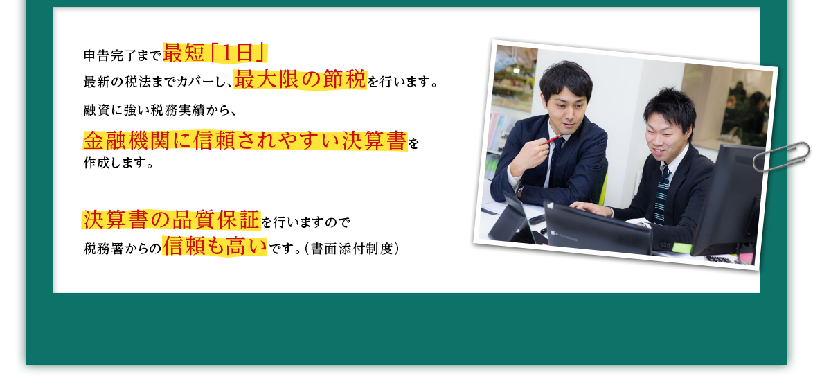 私たちに申告をお任せいただければ、税務署からの意見陳述を求められても、私たち税務のプロフェッショナルが代わりに対応します。餅は餅屋に任せて、自分の本業に心底集中する。それが、一番大切な成功の条件だと思います。